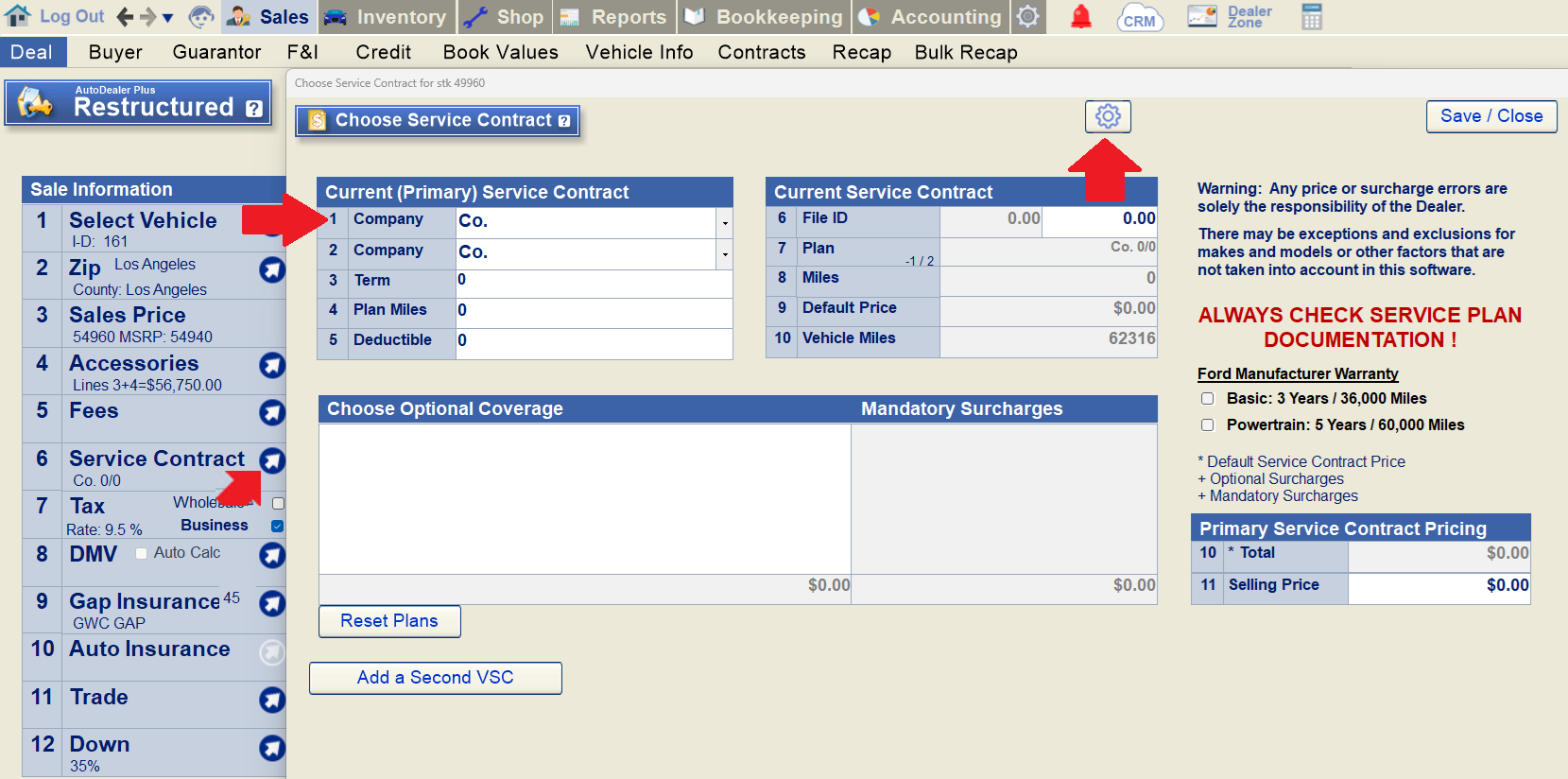 Return to the Deal screen. Click the arrow on line 6 to open the "Choose Service Contract" pop-up. Select "Co" as the Company on line 1. Then, click the arrow on the gear icon to add or manage a plan.